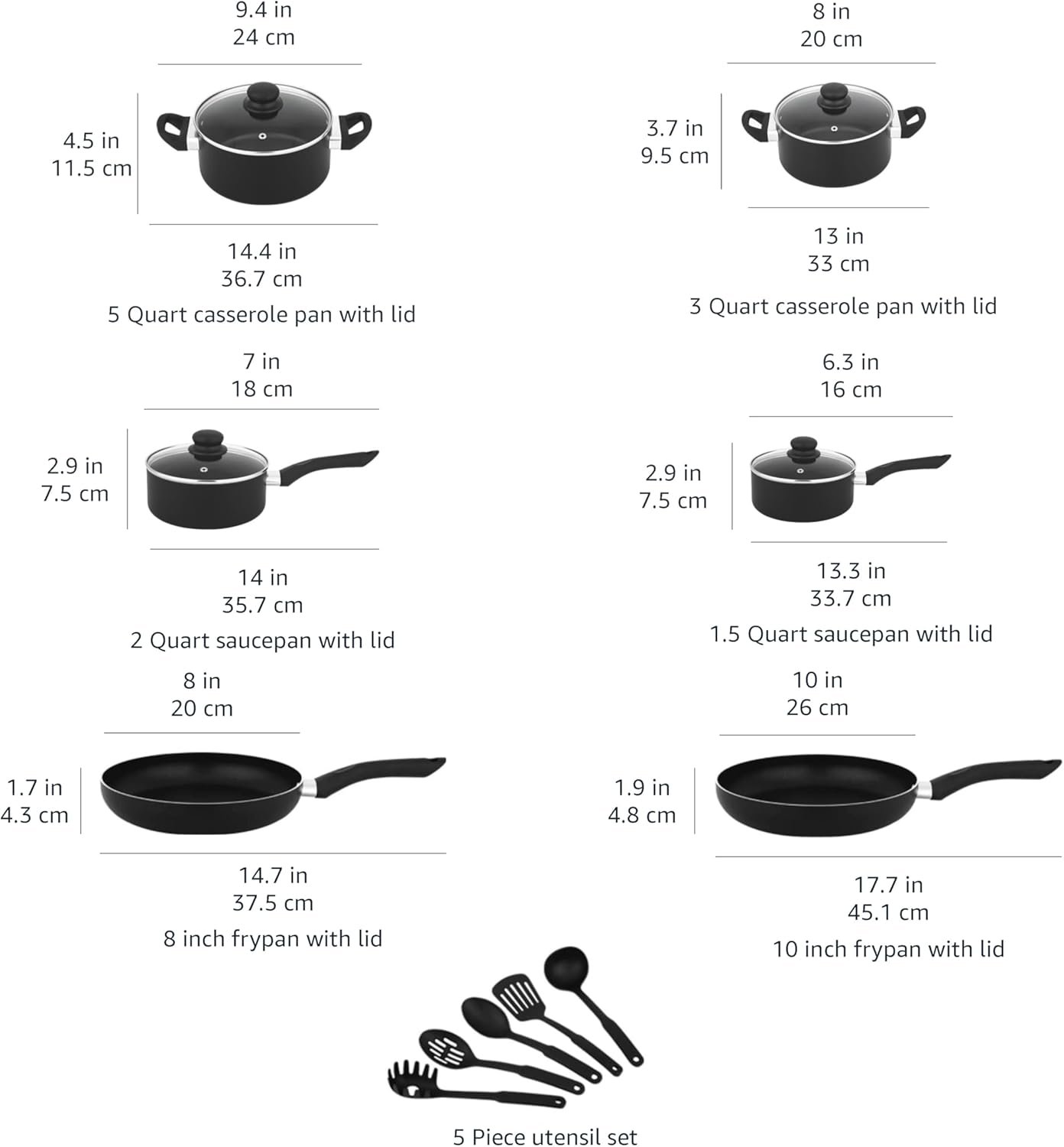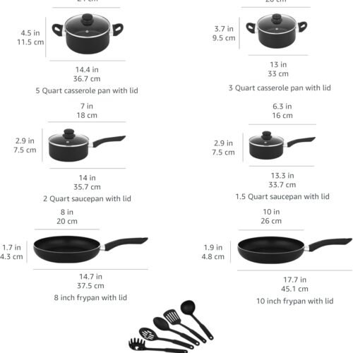 • VERSATILE COOKWARE SET: This nonstick cookware set includes an 8-inch fry pan, 10-inch fry pan, 1.5-quart sauce pan with lid, 2-quart saucepan with lid, 3-quart casserole pan with lid, 5-quart casserole pan with lid, and 5-piece utensil set with pasta server, soup ladle, slotted turner, serving spoon, and slotted serving spoon