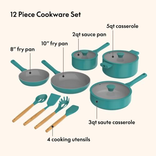 • ALL-IN-ONE SET: Includes 8” and 10” fry pans, a 3qt sauté pan, 2qt saucepan, 5qt casserole, and 4 wood and silicone utensils. Perfect for everything from ramen to casseroles, this cooking set equips you to create any dish with ease and style