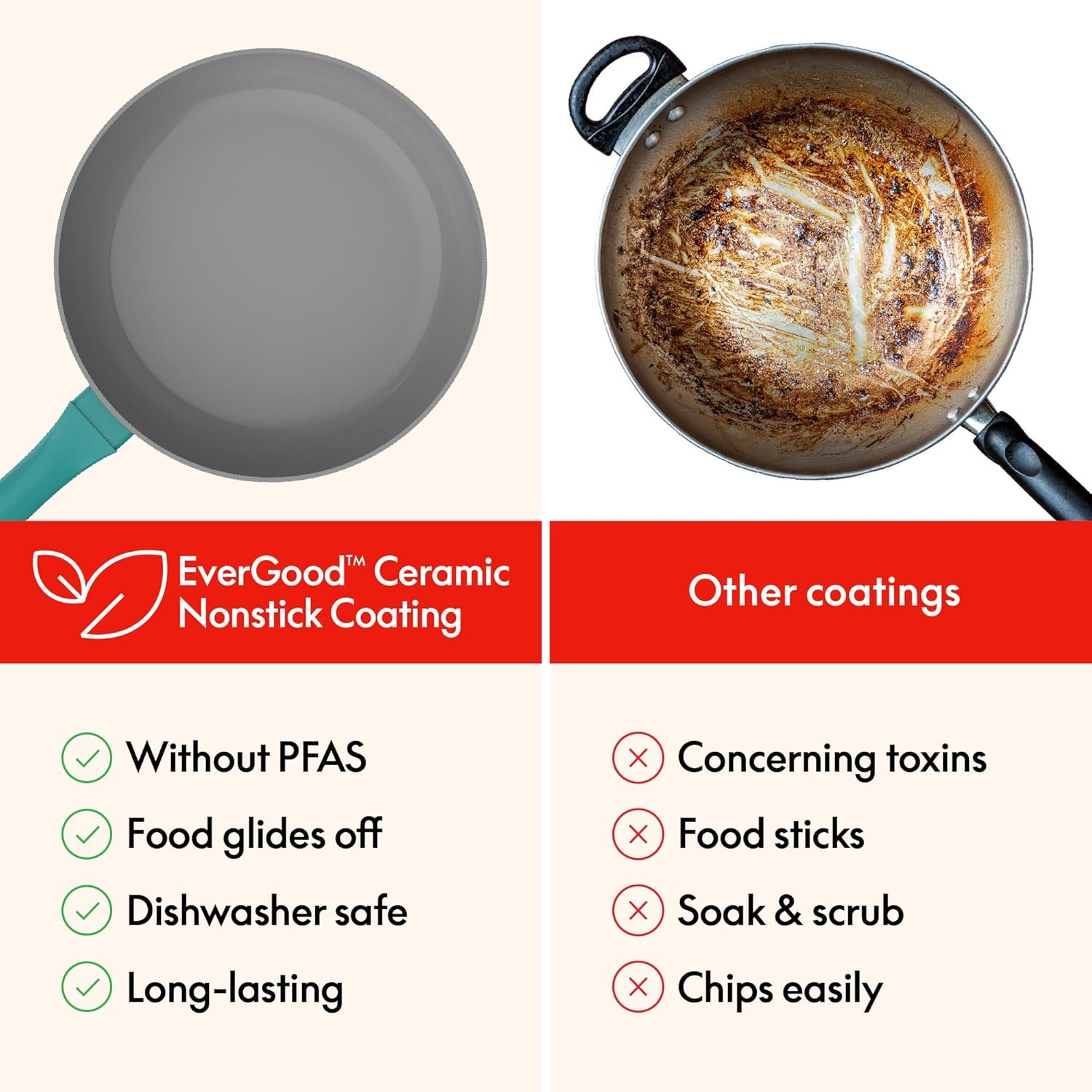 • NONSTICK COATING: Cook confidently with EverGood Ceramic Nonstick Coating, free of PFAS, PFOA, PTFE, lead, and cadmium. Enjoy healthier meals without harmful chemicals, and clean up easily thanks to the durable, ultra-smooth nonstick surface